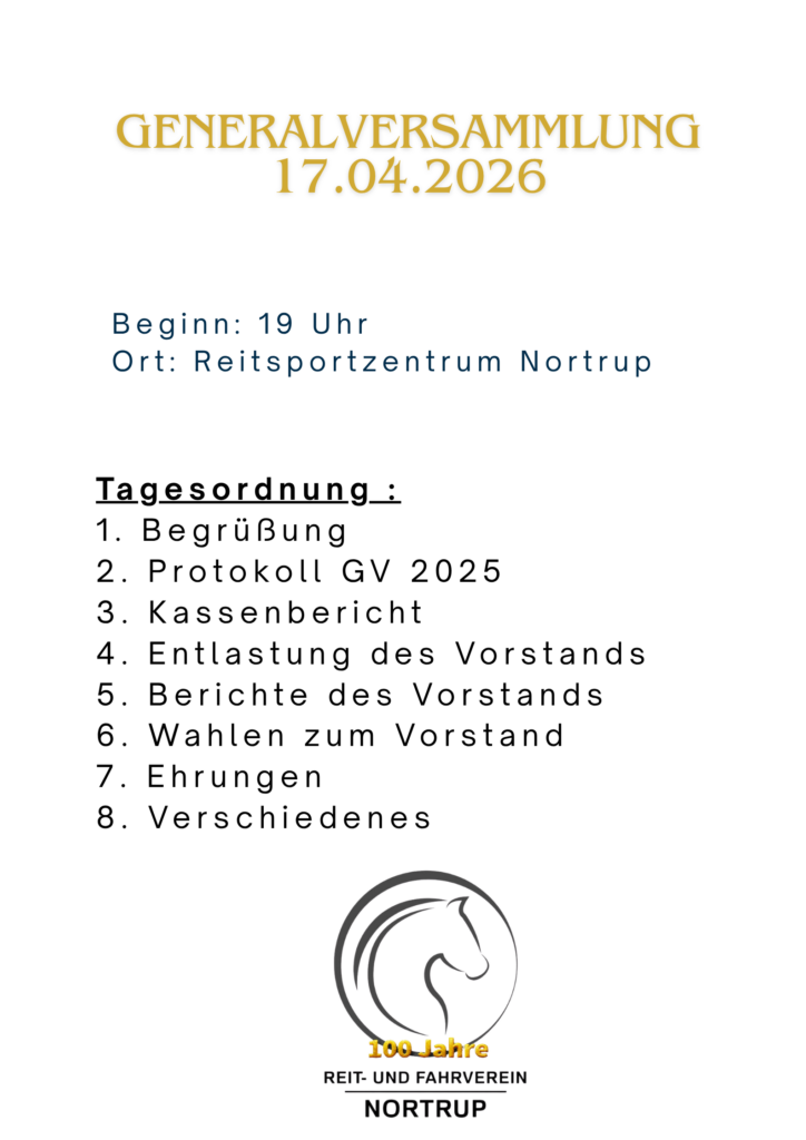 Am 17.04.2026 um 19:00 Uhr findet unsere Generalversammlung in der Reithalle statt. Alle Mitglieder sind hierzu herzlich eingeladen. Wir freuen uns auf viele Teilnehmer. Der Vorstand