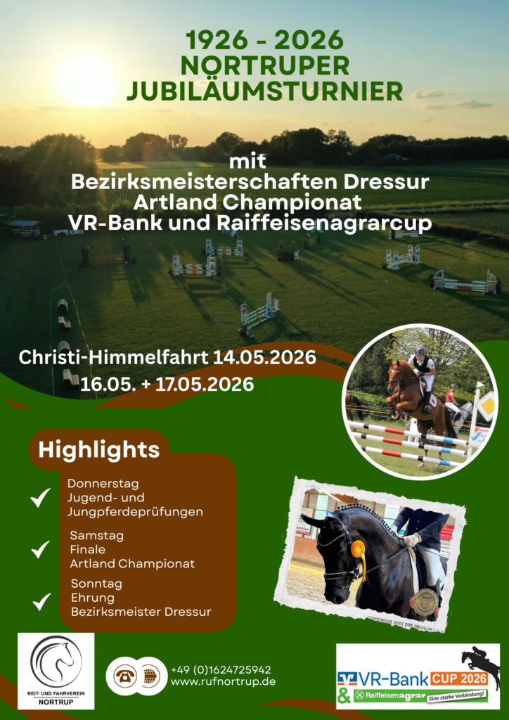 Donnerstag, 14.05. + Samstag, 16.05. + Sonntag 17.05.2026 mit Qualifikationsprüfungen zum VR-Bank und Raiffeisenagrarcup, dem Finale des Artland Championats und den Bezirksmeisterschaften Dressur des Bezirksverbandes Osnabrück Wie jedes Jahr findet am Himmelfahrtstag und dem Wochenende darauf unser Reitturnier statt. Wir sind fleißig dabei unsere Reitsportanlage für das Jubiläumsturnier vorzubereiten. Die Ausschreibung bietet in diesem Jahr Dressurprüfungen bis zur Kl. M** und Springprüfungen bis zur Kl. A**.